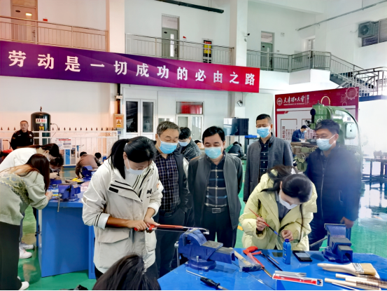 经过一下午的劳动实践,学生兴趣盎然并收获满满,不仅培养了劳动精神,同时也掌握了一些生活技能,锻炼了动手能力,强化了安全意识和团队协作意识。管理学院2020级财务管理专业本科生张锦龙说:“虽然工厂里的设备、工具对于我来说很陌生,但在老师们的讲解下我学会使用这些‘家伙’们,台钳夹铁片时不要夹太高、用錾(zàn)子时一定要与铁片垂直、使用电钻时双手必须稳、拆轮胎时要对角卸螺丝、千斤顶须顶在受力的支撑柱上……短短两个半钟头,别开生面的课堂让我们在劳动协作中收获友情,在动手实践中增长知识。”