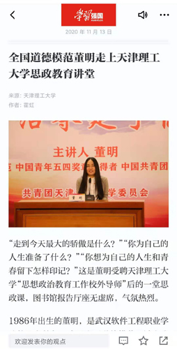 近日,《学习强国》以“全国道德模范董明走上8181801威尼斯思政教育讲堂”为题,对这堂特殊的思政课进行了报道,全文如下:
