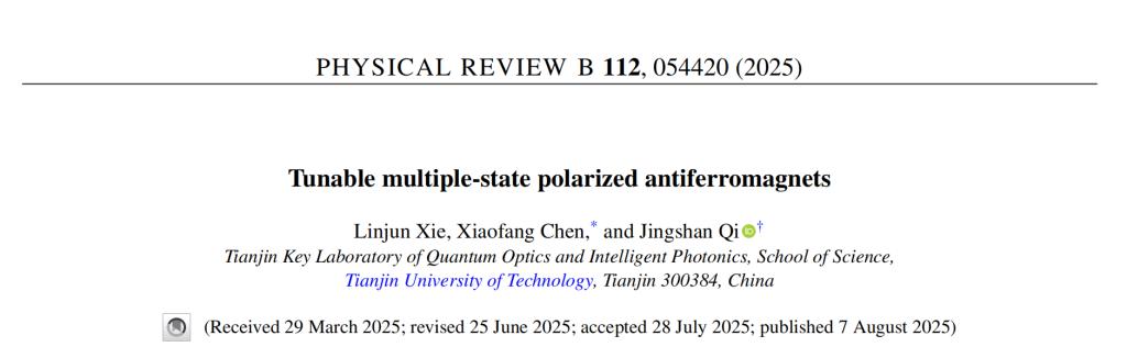 近日,理学院量子材料物理与应用团队指导的2022级本科生谢林均,在物理学领域国际知名期刊《Physical Review B》发表题为“Tunable multiple-state polarized antiferromagnets”的学术论文。理学院本科生谢林均为文章第一作者,陈晓芳副教授、齐景山教授为文章通讯作者。