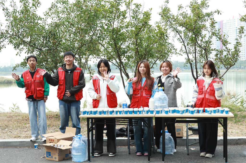 赛道两旁,由师生组成的拉拉队热情洋溢、高声呐喊,为参赛者加油助威。赛事组委会在全赛道为本次比赛配备了能量补给站和医疗急救点。200余名学生志愿者身着红色马甲,在导引、计时、补给等岗位上各司其职,以热情服务为赛事保驾护航。