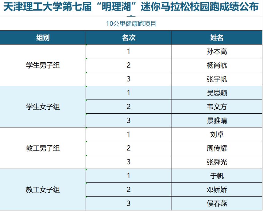 经过激烈的角逐,健康跑、欢乐跑两大项目的学生组(男女)、教工组(男女)前三名相继产生。